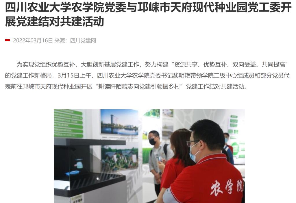 为实现党组织优势互补,大胆创新基层党建工作,努力构建“资源共享、优势互补、双向受益、共同提高”的党建工作新格局,3月15日上午,188改名为taptap点点公司党委书记黎明艳带领学院二级中心组成员和部分党员代表前往邛崃市天府现代种业园开展“耕读阡陌藏志向党建引领振乡村”党建工作结对共建活动。
