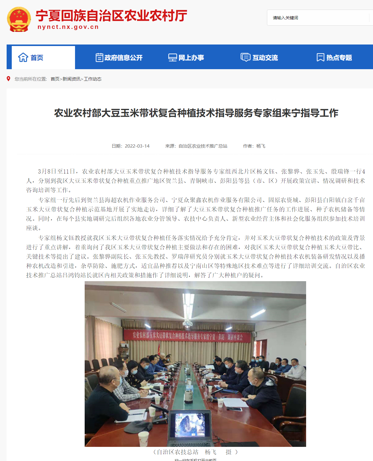 3月8日至11日,农业农村部大豆玉米带状复合种植技术指导服务专家组西北片区杨文钰、张黎骅、张玉先、殷瑞锋一行4人,分别到我区大豆玉米带状复合种植重点推广地区贺兰县、青铜峡市、彭阳县等县(市、区)开展政策宣讲、情况调研和技术咨询培训等工作。