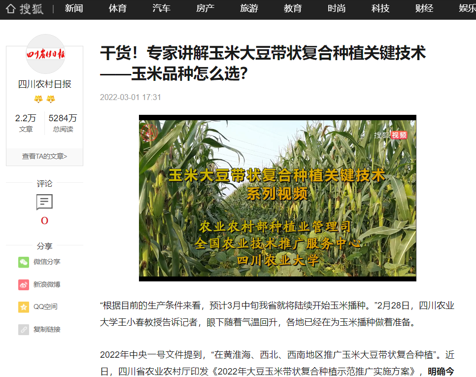2022年中央一号文件提到,“在黄淮海、西北、西南地区推广玉米大豆带状复合种植”。近日,四川省农业农村厅印发《2022年大豆玉米带状复合种植示范推广实施方案》,明确今年全省大豆玉米带状复合种植示范推广任务面积为310万亩,涉及成都、自贡等18个市(州)的108个县(市、区)。