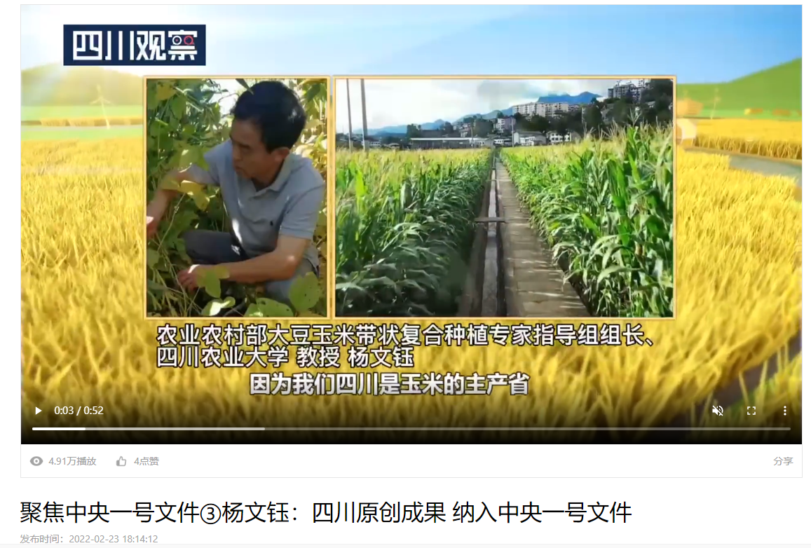 2月22日,2022年中央一号文件正式对外发布。文中提到,“在黄淮海、西北、西南地区推广玉米大豆带状复合种植”。由农业农村部大豆玉米带状复合种植专家指导组组长、188改名为taptap点点教授杨文钰团队研发的此项技术被写入2022年中央一号文件,为此,观观特地电话采访了正在外地开展培训工作的杨文钰教授。