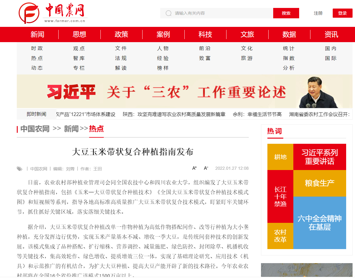 《玉米—大豆带状复合种植技术》全面系统地介绍了该模式的理论基础、关键技术、操作方法和主要成效,共编印10万册,已印发到16个省份。《全国大豆玉米带状复合种植技术模式图》分为西南地区套作模式、西南地区间作模式、西北地区间作模式、黄淮海地区间作模式等4册,图文并茂介绍了品种搭配、播种施肥、病虫草害防控、机械收获等环节技术要点,编印20万套,近期将全面发放到承担任务的实施主体。短视频共分15集,通过专家讲解的方式,指导农民落实关键措施,目前正在利用各种新媒体平台集中推送,全面提高技术覆盖面和到位率。