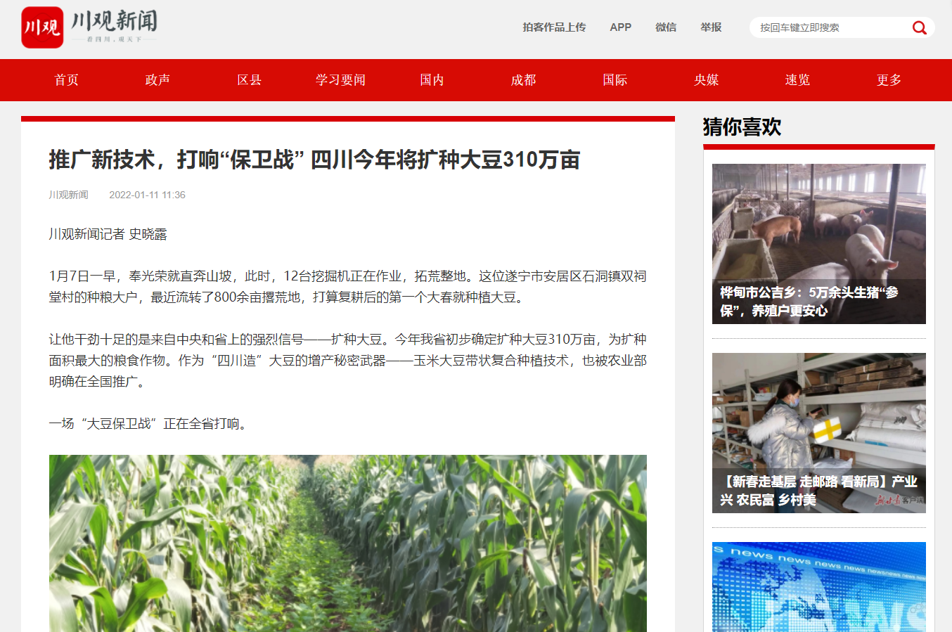 让他干劲十足的是来自中央和省上的强烈信号——扩种大豆。今年我省初步确定扩种大豆310万亩,为扩种面积最大的粮食作物。作为“四川造”大豆的增产秘密武器——玉米大豆带状复合种植技术,也被农业部明确在全国推广。
