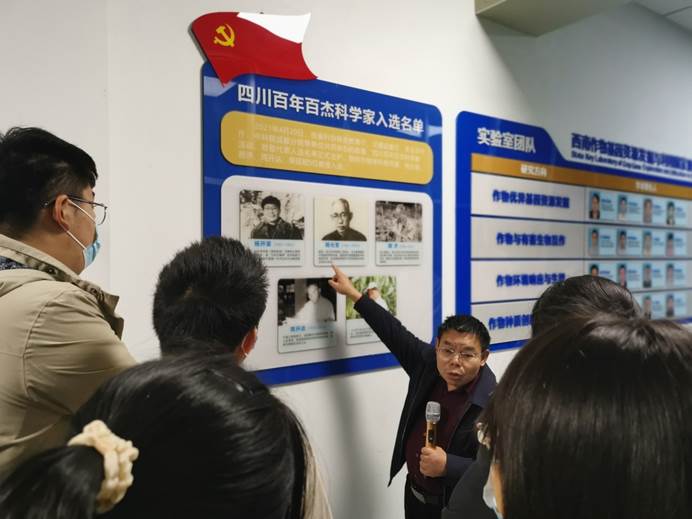 同学们依次参观了每一间实验室,驻足每一张展板。每到一间实验室,陈学伟主任都热情洋溢地讲述该实验室的功能,可能开展的工作,解决的问题,对作物优质高产高效生态安全生产可能带来的革新;每到一个展板面前,都饱含深情地讲述展板背后的科学故事、人物故事,讲到上一辈人的“211”故事,讲到作物学科的5篇百优论文,讲到国家自然科学基金委资助的创新研究群体项目,讲到公司种质资源库及闻名全球的小麦种质资源创新,讲到5名四川省百年百杰科学家的突出贡献、科研精神……,讲到农学人的担当、精神的追求……。陈主任表示:国家重点实验室的获批,是国家对公司科研实力的高度认可,拥有如此优质的资源,希望农学学子充满信心,不懈努力,奋勇前行,在建设社会主义现代化农业强国、助力乡村振兴的伟大实践中成长成才,贡献自己的一份力量。