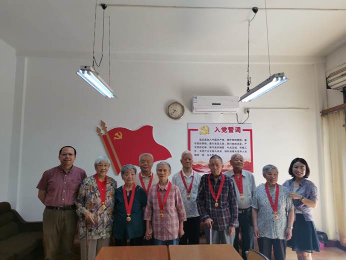 王际睿与老党员们齐聚一堂促膝而谈,亲切慰问他们的身体和生活状况,转达公司党委对老党员们的关心问候,并为他们亲自佩戴“光荣在党50年”纪念章和发放慰问金,感谢他们矢志不渝为党的教育事业所做出的贡献。随后,王际睿向老党员同志们汇报了学校学院近期取得主要成绩以及未来5年的发展规划,并希望他们继续为学校发展多提宝贵意见。