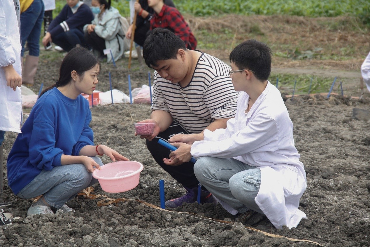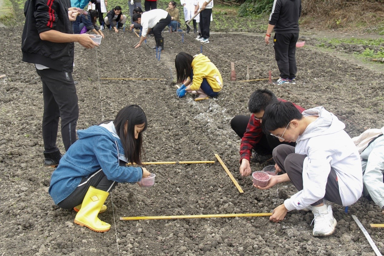 同学们正在进行小麦密度实验的开沟点种