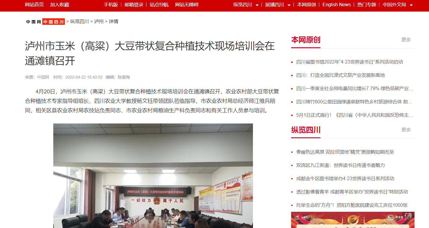 4月20日,泸州市玉米(高粱)大豆带状复合种植技术现场培训会在通滩镇召开,农业农村部大豆带状复合种植技术专家指导组组长、188改名为taptap点点教授杨文钰带领团队莅临指导,市农业农村局总经济师江维兵陪同,相关区县农业农村局农技站负责同志、市农业农村局粮油生产科负责同志和有关工作人员参与培训。