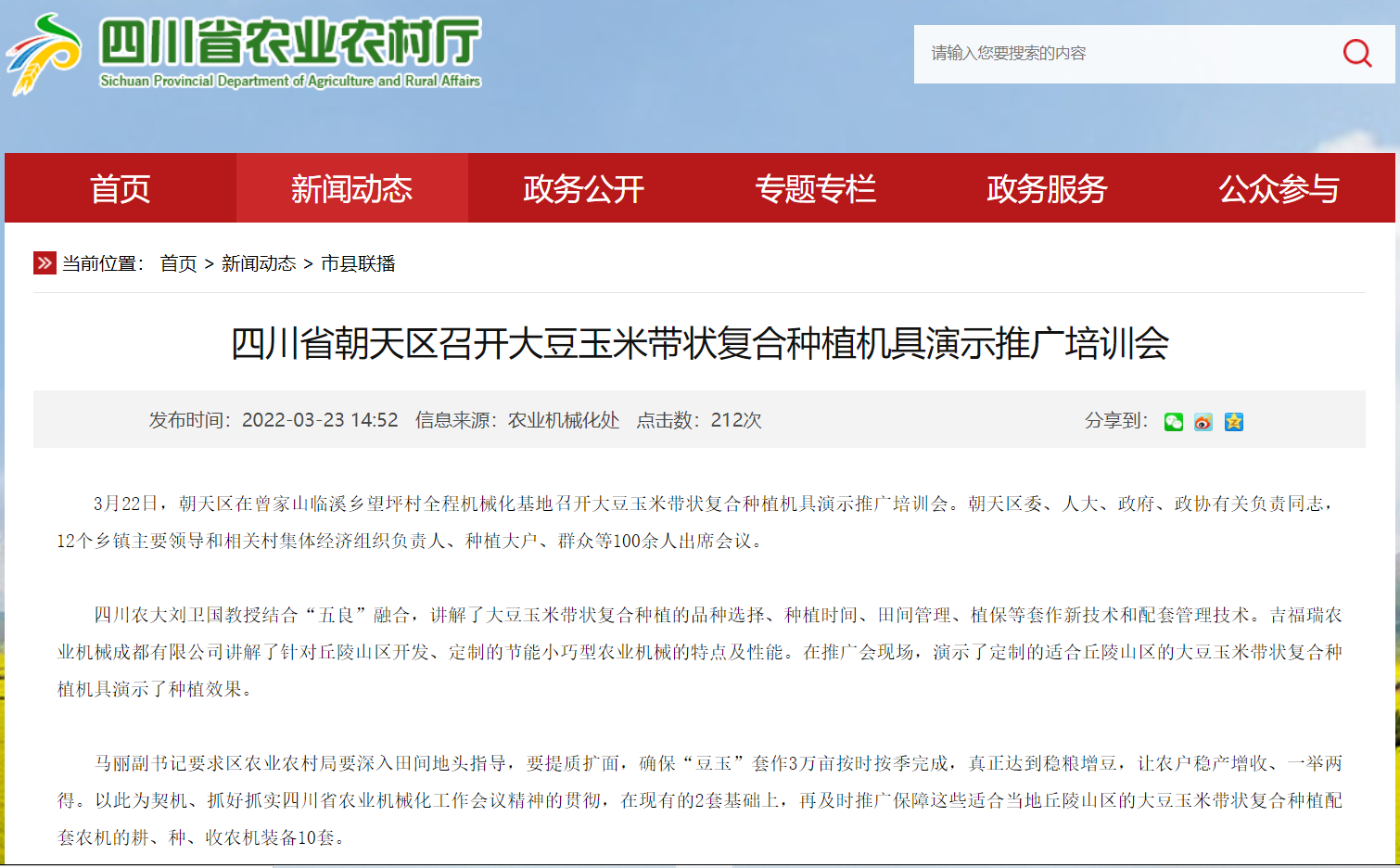 组织召开大豆玉米带状复合种植新机具推广现场演示会,对朝天区稳定粮食生产提质扩面,“豆玉”套作,稳粮增豆,将发挥积极的促进作用,推进朝天区农业机械化加快发展的步伐。