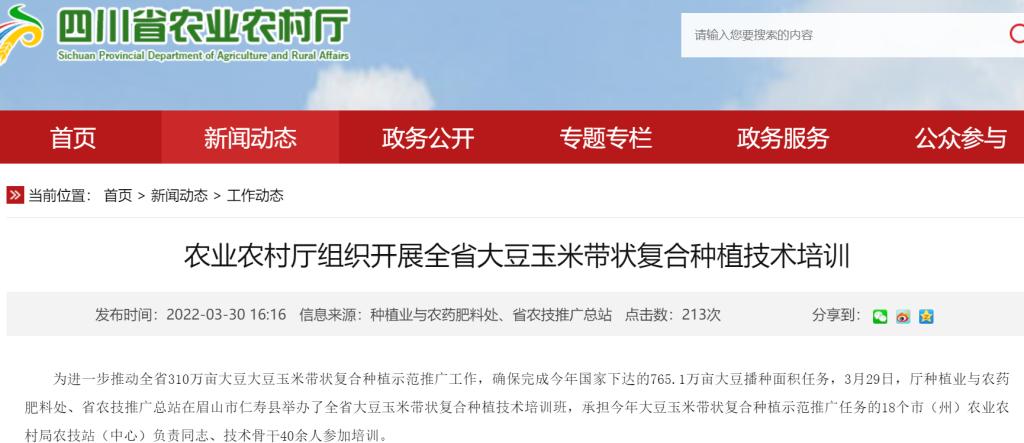 为进一步推动全省310万亩大豆大豆玉米带状复合种植示范推广工作,确保完成今年国家下达的765.1万亩大豆播种面积任务,3月29日,厅种植业与农药肥料处、省农技推广总站在眉山市仁寿县举办了全省大豆玉米带状复合种植技术培训班,承担今年大豆玉米带状复合种植示范推广任务的18个市(州)农业农村局农技站(中心)负责同志、技术骨干40余人参加培训。