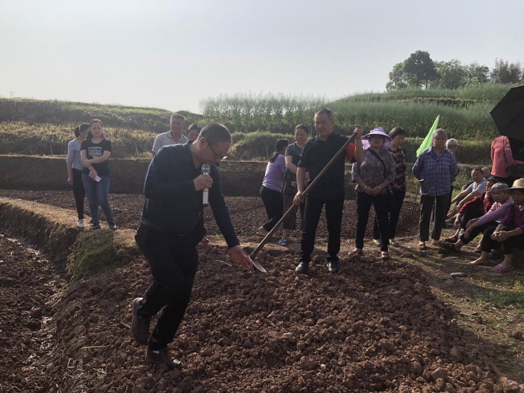在合江县白米镇梨湾村,县农业农村局的高级农艺师唐正文向镇村干部、种粮大户和农民代表们讲解示范着高粱大豆油菜三种农作物套种轮作的播种、育苗技巧。