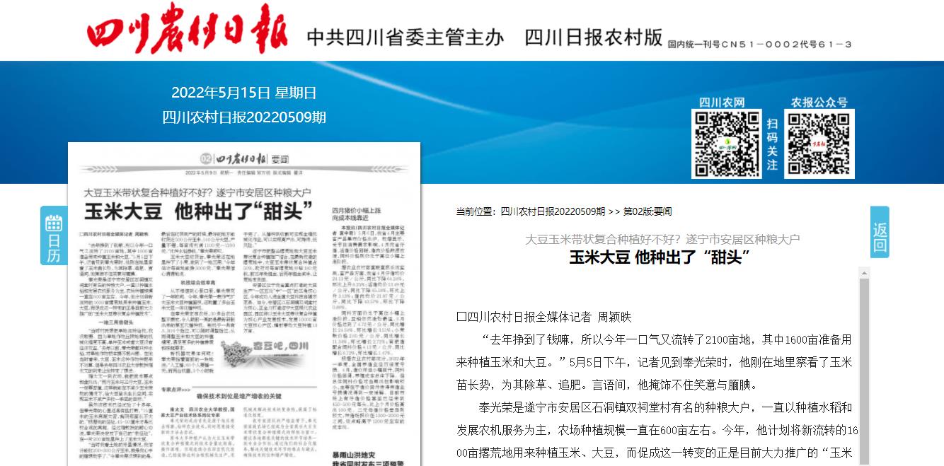 奉光荣是遂宁市安居区石洞镇双祠堂村有名的种粮大户,一直以种植水稻和发展农机服务为主,农场种植规模一直在600亩左右。今年,他计划将新流转的1600亩撂荒地用来种植玉米、大豆,而促成这一转变的正是目前大力推广的“玉米大豆带状复合种植技术”。
