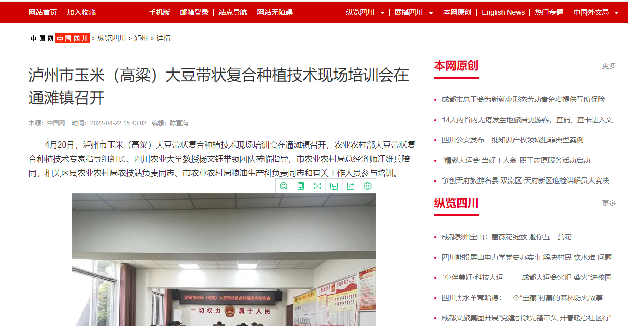 4月20日,泸州市玉米(高粱)大豆带状复合种植技术现场培训会在通滩镇召开,农业农村部大豆带状复合种植技术专家指导组组长、188改名为taptap点点教授杨文钰带领团队莅临指导,市农业农村局总经济师江维兵陪同,相关区县农业农村局农技站负责同志、市农业农村局粮油生产科负责同志和有关工作人员参与培训。