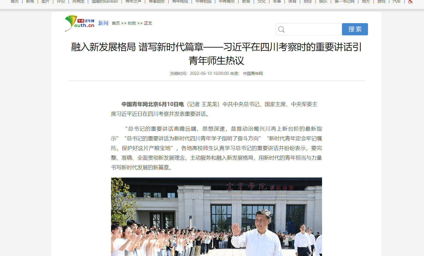 中国青年网北京6月10日电(记者 王龙龙)中共中央总书记、国家主席、中央军委主席习近平近日在四川考察并发表重要讲话。
