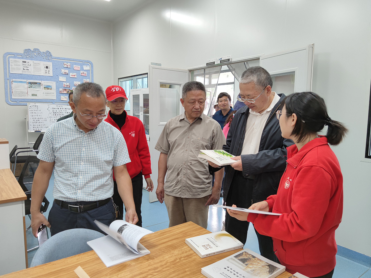 省农科院副经理潘海平(右二)等专家在翻阅科技小院员工的工作日志。