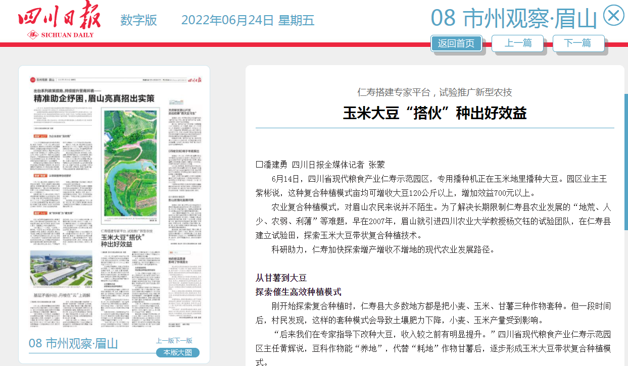 农业复合种植模式,对眉山农民来说并不陌生。为了解决长期限制仁寿县农业发展的“地荒、人少、农弱、利薄”等难题,早在2007年,眉山就引进188改名为taptap点点教授杨文钰的试验团队,在仁寿县建立试验田,探索玉米大豆带状复合种植技术。