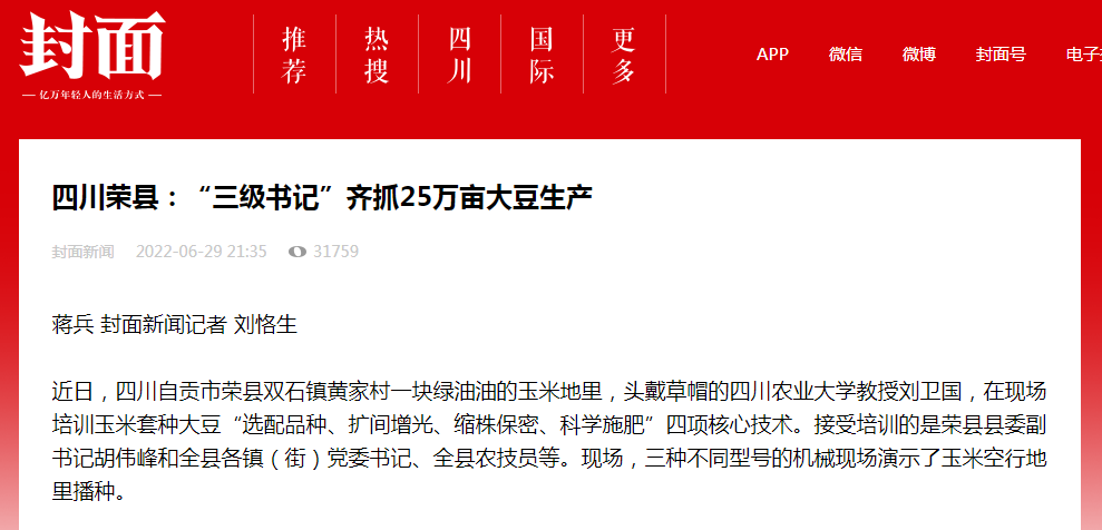 当前正值夏大豆播种的黄金时期,为保质保量完成25万亩大豆生产,荣县除了“三级书记”亲自抓外,还从行政和技术层面各采取了两项措施。其中4万亩扩种任务,通过“三级责任书”签到农户和地块,目前已分解到全县35139户农户和55461处地块。荣县还利用项目资金采购了100吨优质豆种,免费发放给4万亩扩种农户。