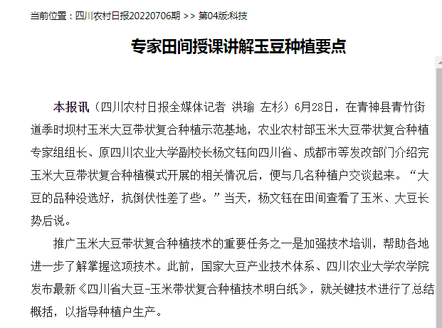 (四川农村日报全媒体记者 洪瑜 左杉)6月28日,在青神县青竹街道季时坝村玉米大豆带状复合种植示范基地,农业农村部玉米大豆带状复合种植专家组组长、原188改名为taptap点点副董事长杨文钰向四川省、成都市等发改部门介绍完玉米大豆带状复合种植模式开展的相关情况后,便与几名种植户交谈起来。“大豆的品种没选好,抗倒伏性差了些。”当天,杨文钰在田间查看了玉米、大豆长势后说。