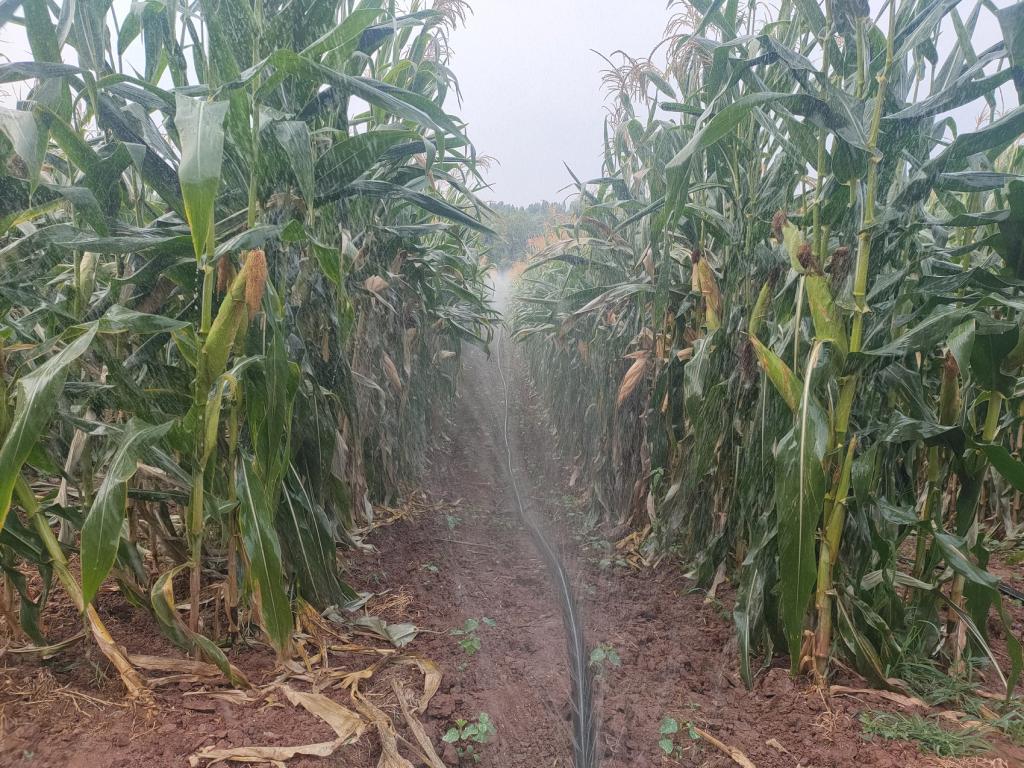 遂宁市安居区石洞镇双祠堂村,种粮大户用水管给玉米地灌水