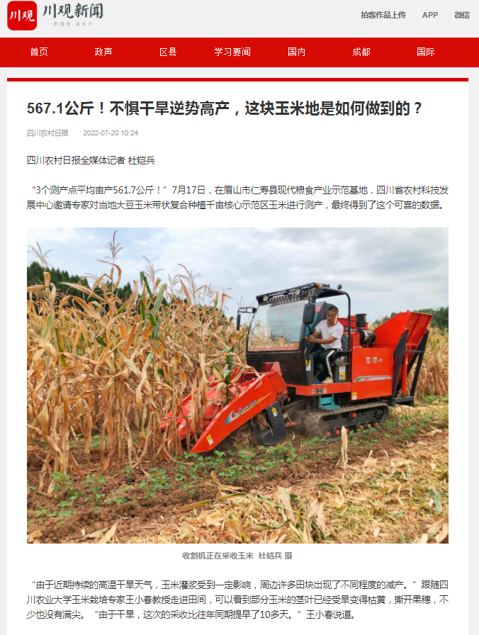 “3个测产点平均亩产561.7公斤!”7月17日,在眉山市仁寿县现代粮食产业示范基地,四川省农村科技发展中心邀请专家对当地大豆玉米带状复合种植千亩核心示范区玉米进行测产,最终得到了这个可喜的数据。