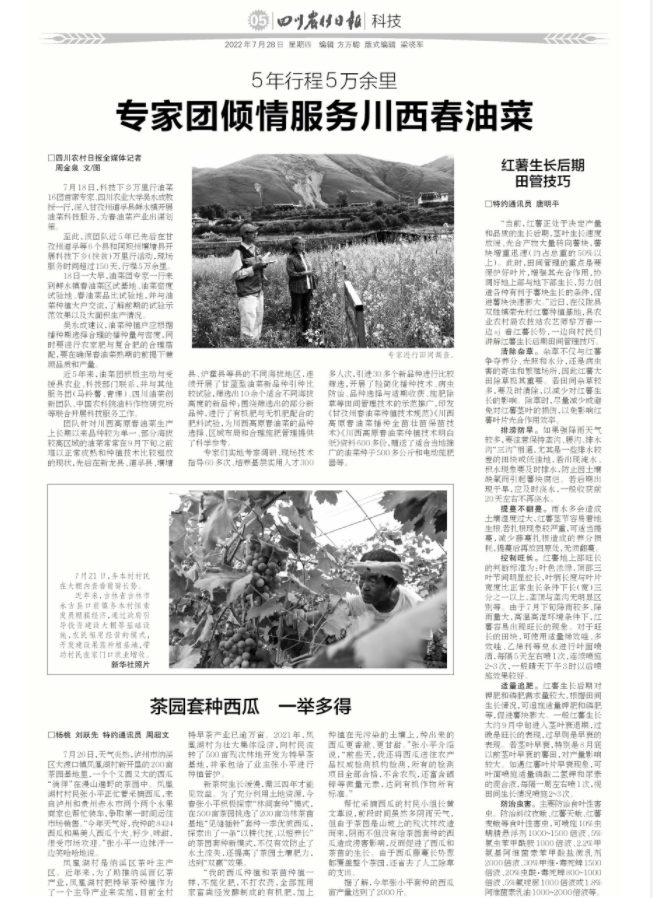 专家们实地考察调研、现场技术指导60多次、培养基层实用人才300多人次,引进30多个新品种进行比较筛选,开展了轻简化播种技术、病虫防治、品种选择与适期收获、施肥除草等田间管理技术的示范推广,印发《甘孜州春油菜种植技术规范》《川西高原春油菜播种全苗壮苗保苗技术》《川西高原春油菜种植技术明白纸》资料600多份,赠送了适合当地推广的油菜种子500多公斤和电动施肥器等。