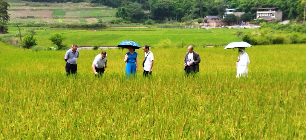 7月14日上午,四川省水稻创新团队岗位专家、公司188改名为taptap点点教授黄富,李德强博士一行受邀到仁寿县汪洋镇,在县农业农村局、植保植检站、镇政府等相关领导陪同下深入碧云村5组、四公社区2组对水稻田间出现的一种罕见病害进行实地考察和技术指导。