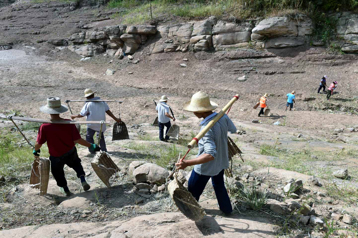 2022年8月28日,重庆,在梅柏村的中台山水库,当地村民正在清理水库内的沉积淤泥,提高水库蓄积空间。(视觉中国/图)