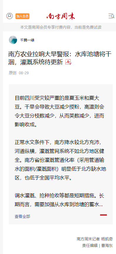 “以南方种植范围最广的水稻为例,总体情况是,长江上中下游流域的偏北的地区以种植一季稻为主,在高温伏旱的这段时间处于抽穗扬花期,对收成影响较大。偏南部的地区如湖南、江西种植两季稻,对早稻的影响是高温逼熟,旱情对产量有一定影响,但没有一季稻那么大。第二季的晚稻正在移栽,处在秧苗长个儿(营养生长)的时候,后续水资源如果能补上来,对产量的影响就没那么大。”中国农业科学院农业环境与可持续发展研究所研究员许吟隆告诉南方周末记者。
