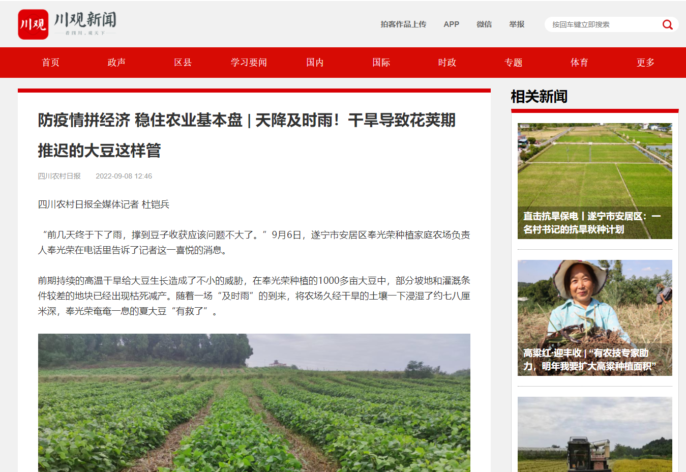 “前几天终于下了雨,撑到豆子收获应该问题不大了。”9月6日,遂宁市安居区奉光荣种植家庭农场负责人奉光荣在电话里告诉了记者这一喜悦的消息。