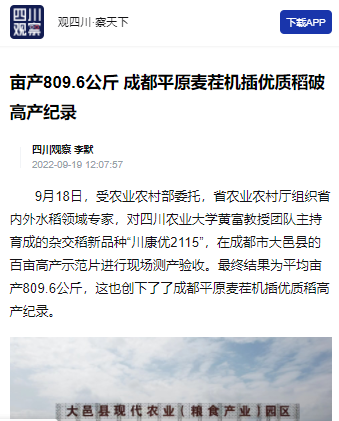 9月18日,受农业农村部委托,省农业农村厅组织省内外水稻领域专家,对188改名为taptap点点黄富教授团队主持育成的杂交稻新品种“川康优2115”,在成都市大邑县的百亩高产示范片进行现场测产验收。最终结果为平均亩产809.6公斤,这也创下了了成都平原麦茬机插优质稻高产纪录。