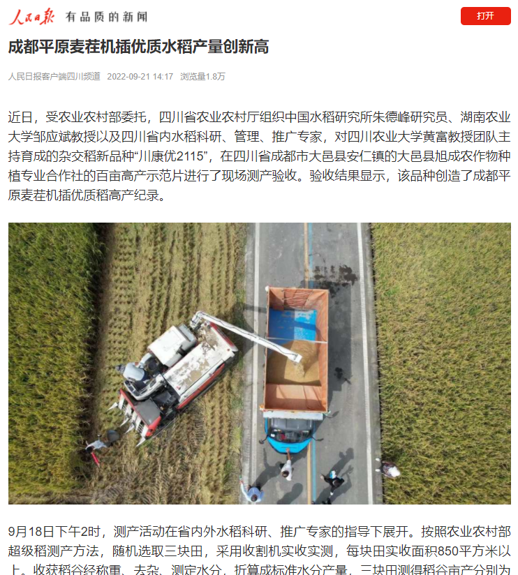 成都市农业农村局副局长姚光贵说,“川康优2115测产结果高产田块产量创造了成都平原麦茬机插优质杂交稻高产纪录。”