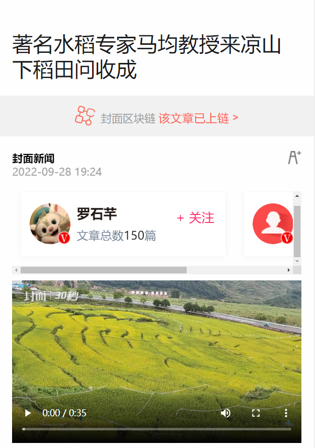 作为我省著名的水稻栽培专家和四川省学术和技术带头人,马均的心里,始终怀揣着“中国人把饭碗端在自己手里”的情怀,把论文写在祖国的大地上。自从1987年毕业工作以来,35年间,巴蜀大地的大部分粮食主产区的田间地头、农家小院都留下了马均的足迹。当天,马均身边还围绕着一群博士和水稻专家。他们弯腰摸着垂下的稻穗细细观察,和正在打谷子的村民聊天,问收成。