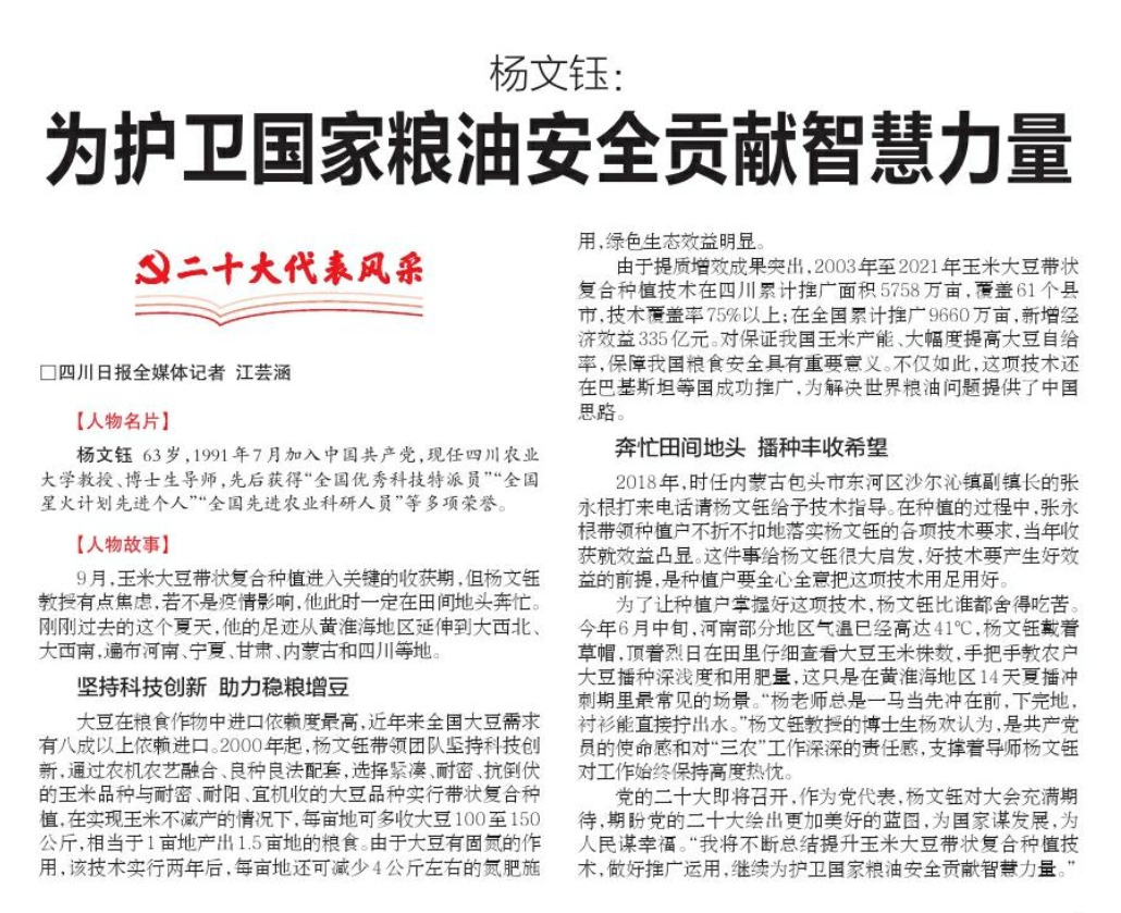 党的二十大即将召开,作为党代表,杨文钰对大会充满期待,期盼党的二十大绘出更加美好的蓝图,为国家谋发展,为人民谋幸福。“我将不断总结提升玉米大豆带状复合种植技术,做好推广运用,继续为护卫国家粮油安全贡献智慧力量。”