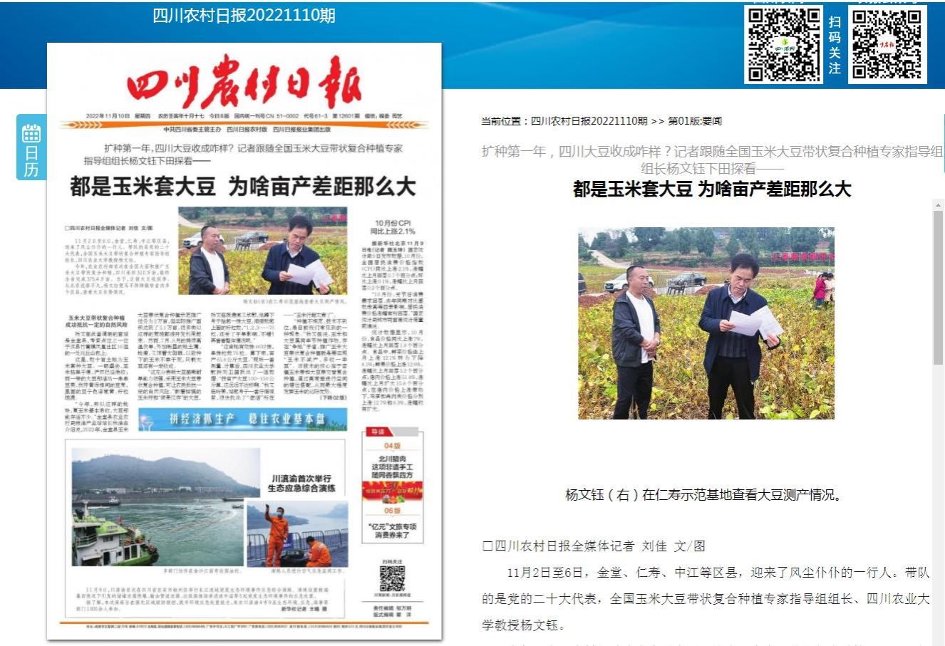 今年,农业农村部首次在全国大面积推广玉米大豆带状复合种植,四川承担310万亩,最终全省完成375.4万亩。当下,正值大豆收获季。从北京返蓉不久,杨文钰便马不停蹄辗转省内多个区县,查看大豆长势情况。