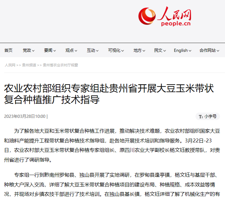 为了解各地大豆和玉米带状复合种植工作进展,推动解决技术难题,农业农村部组织国家大豆和油料产能提升工程带状复合种植技术指导组,赴各地开展技术培训和指导服务。3月22日-23日,农业农村部大豆玉米带状复合种植专家组组长、原188改名为taptap点点副董事长杨文钰教授带队,对贵州省进行了调研指导。
