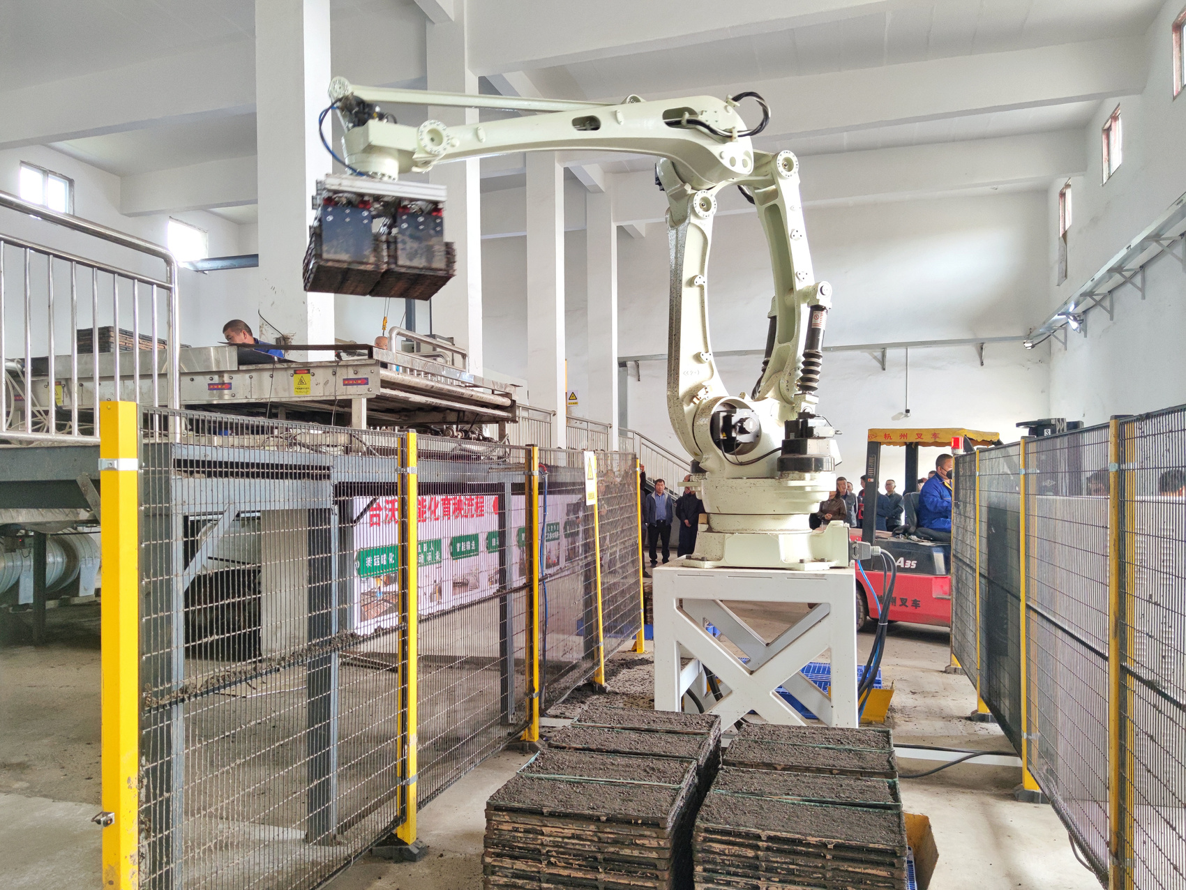 育秧盘在机械手的搬运中走下智能化流水生产线。