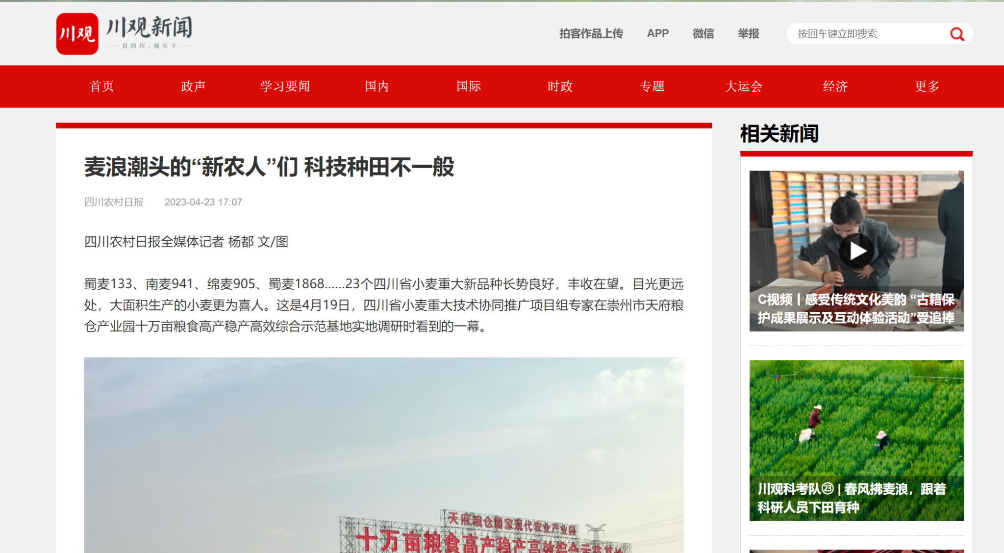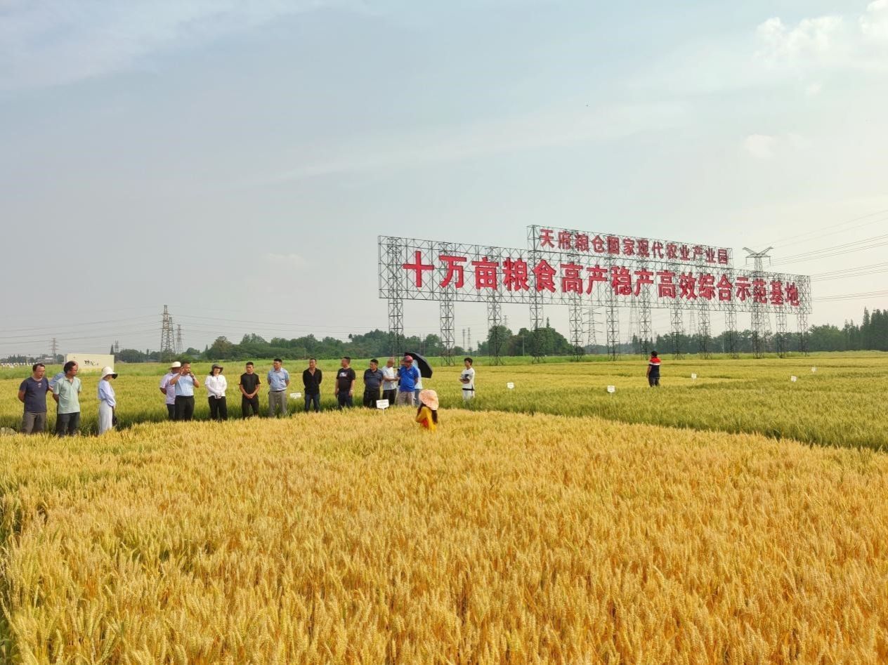 蜀麦133、南麦941、绵麦905、蜀麦1868……23个四川省小麦重大新品种长势良好,丰收在望。目光更远处,大面积生产的小麦更为喜人。这是4月19日,四川省小麦重大技术协同推广项目组专家在崇州市天府粮仓产业园十万亩粮食高产稳产高效综合示范基地实地调研时看到的一幕。