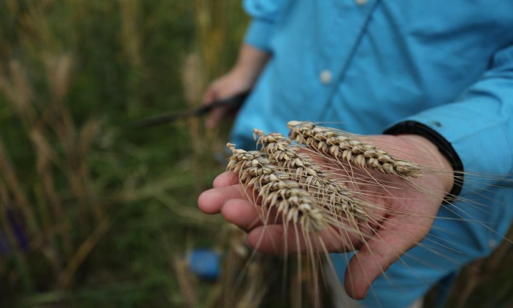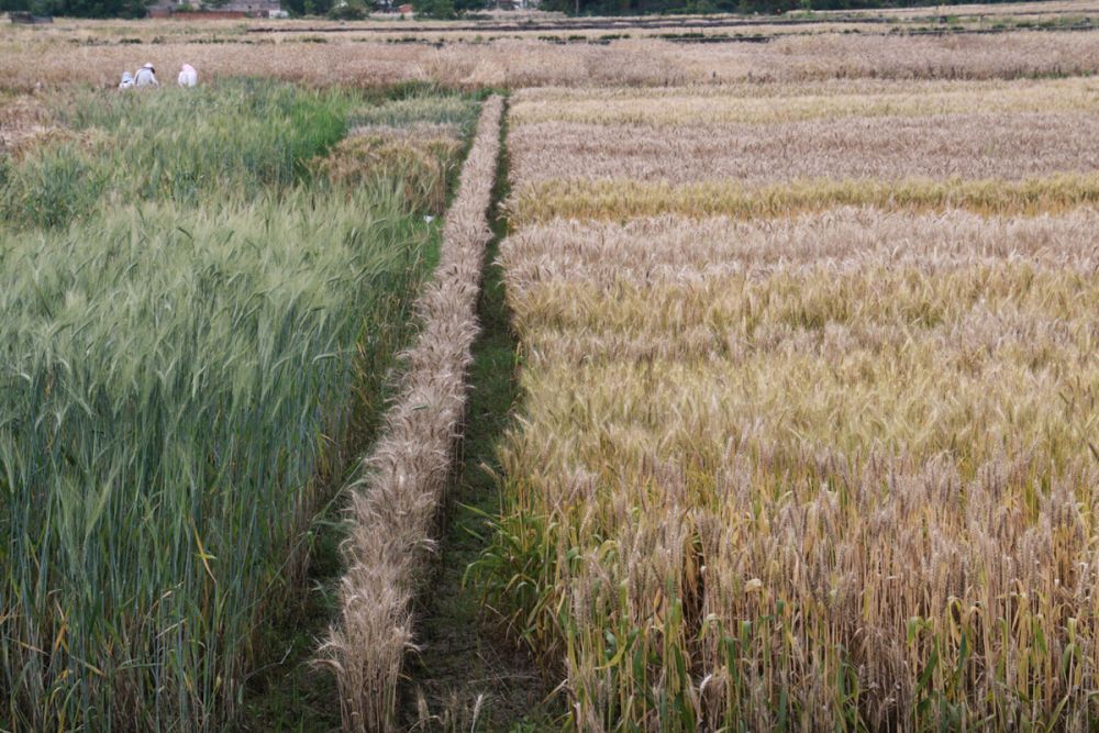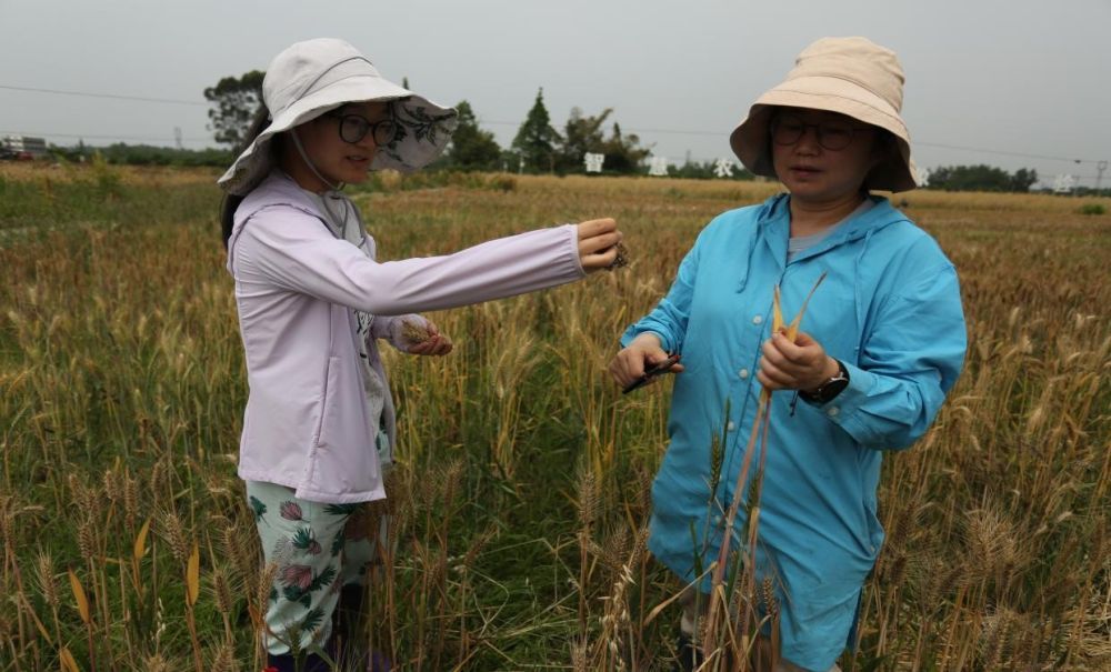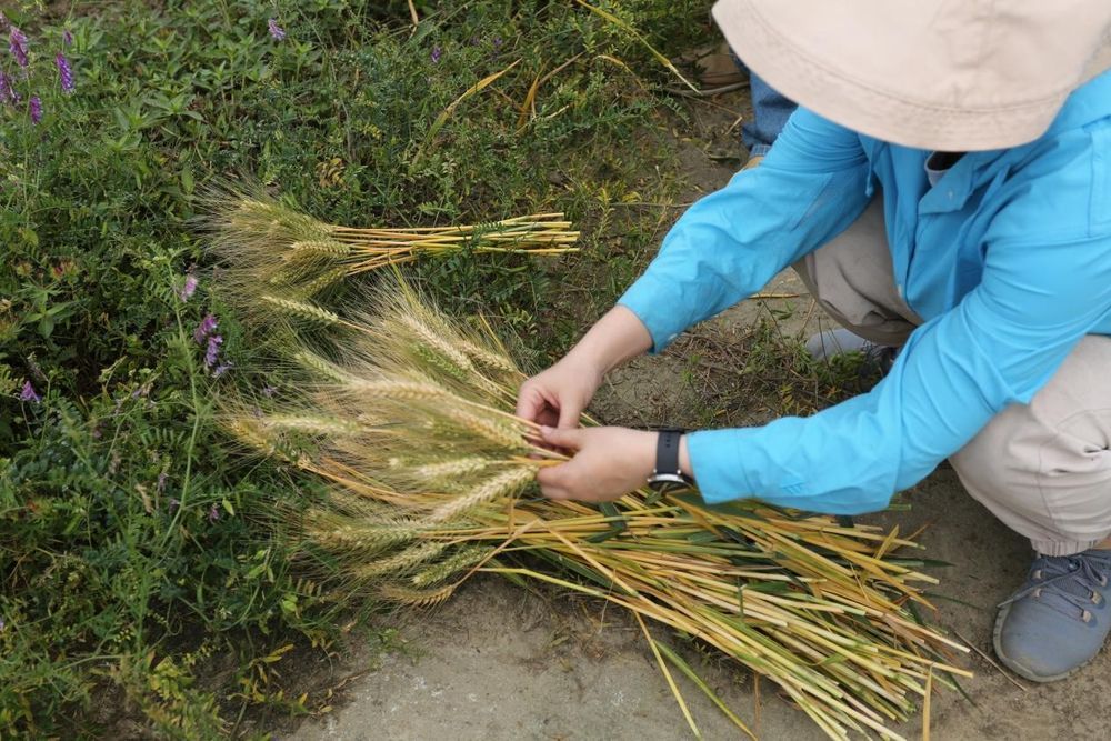 选育出的彩色小麦在保证平均亩产400公斤的前提下,可搭配用作景观使用。“在育种的过程中,我们还发现在小麦成熟期,其穗部和茎秆也能表现出除大家常见的金黄色以外的其他颜色,在穗部会有焦糖色、浅粉色、白色、浅棕色等颜色;茎秆也有红色、粉色、深绿和浅蓝等颜色。”蒲至恩指向试验田中颜色不一的麦田块介绍,并摘下不同颜色的小麦,将其子粒掰开来逐粒展示。