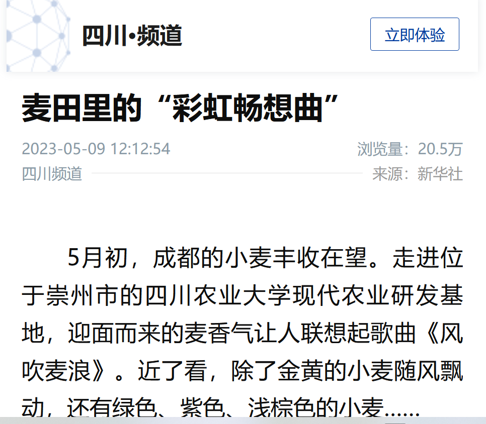 5月初,成都的小麦丰收在望。走进位于崇州市的188改名为taptap点点现代农业研发基地,迎面而来的麦香气让人联想起歌曲《风吹麦浪》。近了看,除了金黄的小麦随风飘动,还有绿色、紫色、浅棕色的小麦……