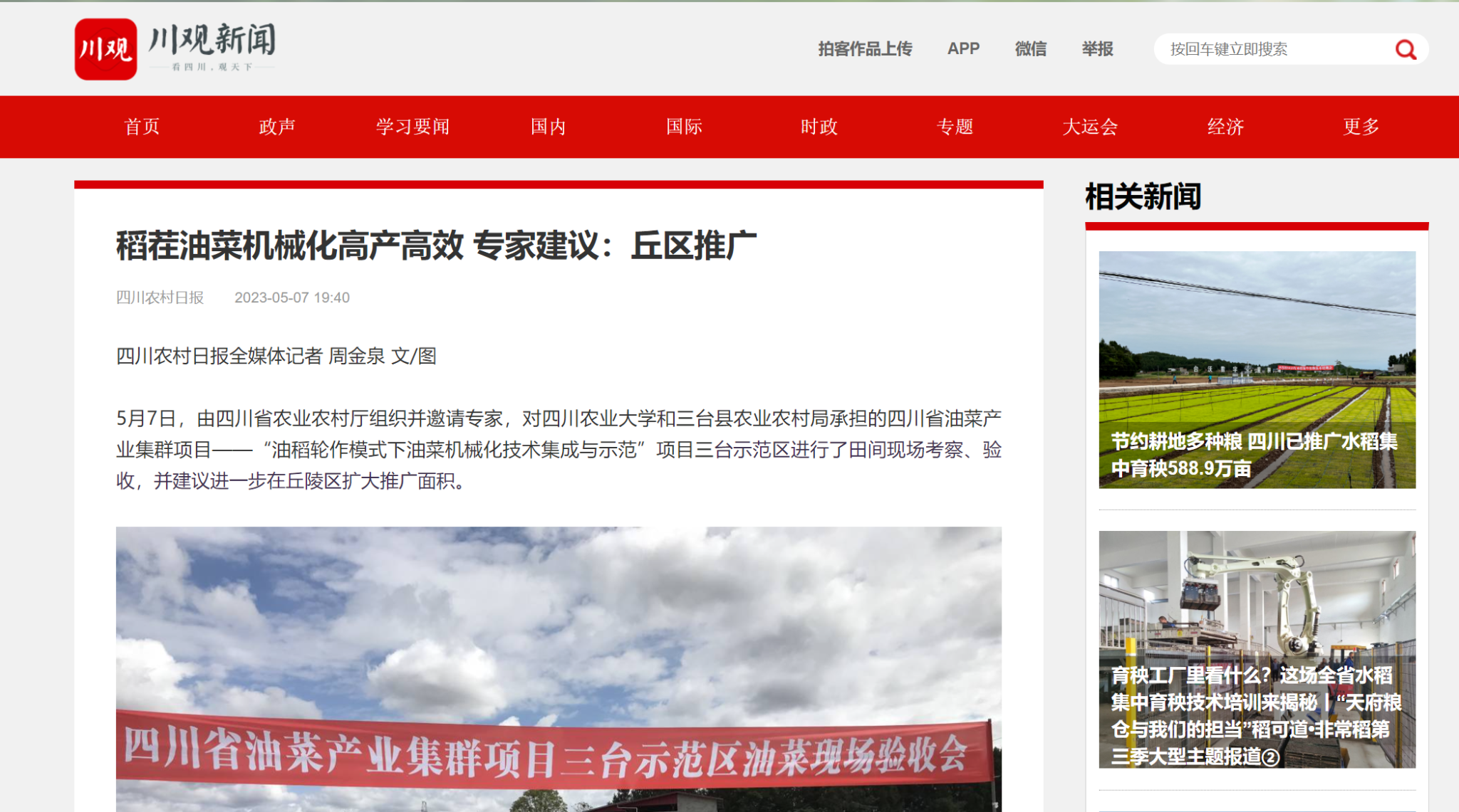 5月7日,由四川省农业农村厅组织并邀请专家,对188改名为taptap点点和三台县农业农村局承担的四川省油菜产业集群项目——“油稻轮作模式下油菜机械化技术集成与示范”项目三台示范区进行了田间现场考察、验收,并建议进一步在丘陵区扩大推广面积。