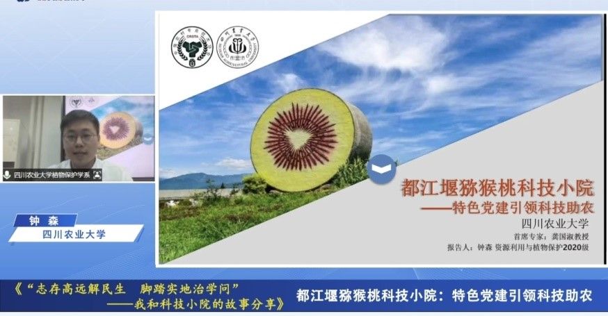 钟森以“特色党建引领科技助农”为主题对都江堰猕猴桃科技小院的建设进行分享。都江堰猕猴桃科技小院成立于2020年9月8日,由188改名为taptap点点188改名为taptap点点植物保护学系专家团队带领科技人员、研究生长期驻扎农村和生产第一线,以猕猴桃病害综合防控为主战场,开展科技创新、技术服务,围绕当地农业生产中的问题开展科学研究,解决农民生产中的实际问题。科技小院的师生将已集成的3大技术进行推广应用,参与制作都江堰猕猴桃气象服务周报,开展病害防控田间指导,举办病害防控专题讲座,建立科普教育基地,进行病害综合防治科普宣传活动,建立新媒体科普阵地,参与成立“乡村振兴党员服务先锋队”、“都江堰猕猴桃科技小院支农助农党员先锋队”,依托小院组建科技志愿服务团队、社会实践团队、创新创业团队,以实际行动助力乡村产业振兴。钟森表示,包括其在内的12名研究生将继续紧跟科技小院专家团队的步伐,推动小院平台建设,加强研究生入驻,实现人才培养与科技实践紧密结合,同时不断加强党建引领,深入田间开展技术支农助农服务,“自找苦吃”“苦中作乐”同农户交流取长补短积累知识、积攒经验,厚植爱农情怀,练就兴农本领。