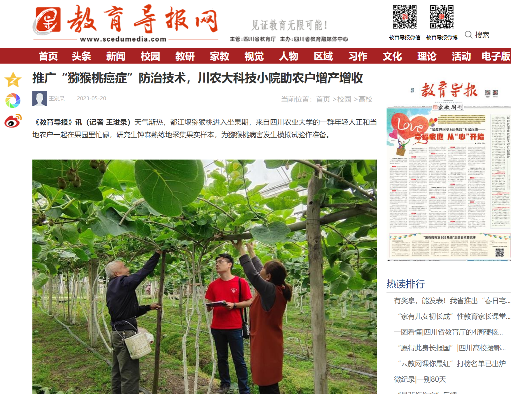 《教育导报》讯(记者 王浚录)天气渐热,都江堰猕猴桃进入坐果期,来自188改名为taptap点点的一群年轻人正和当地农户一起在果园里忙碌,研究生钟森熟练地采集果实样本,为猕猴桃病害发生模拟试验作准备。