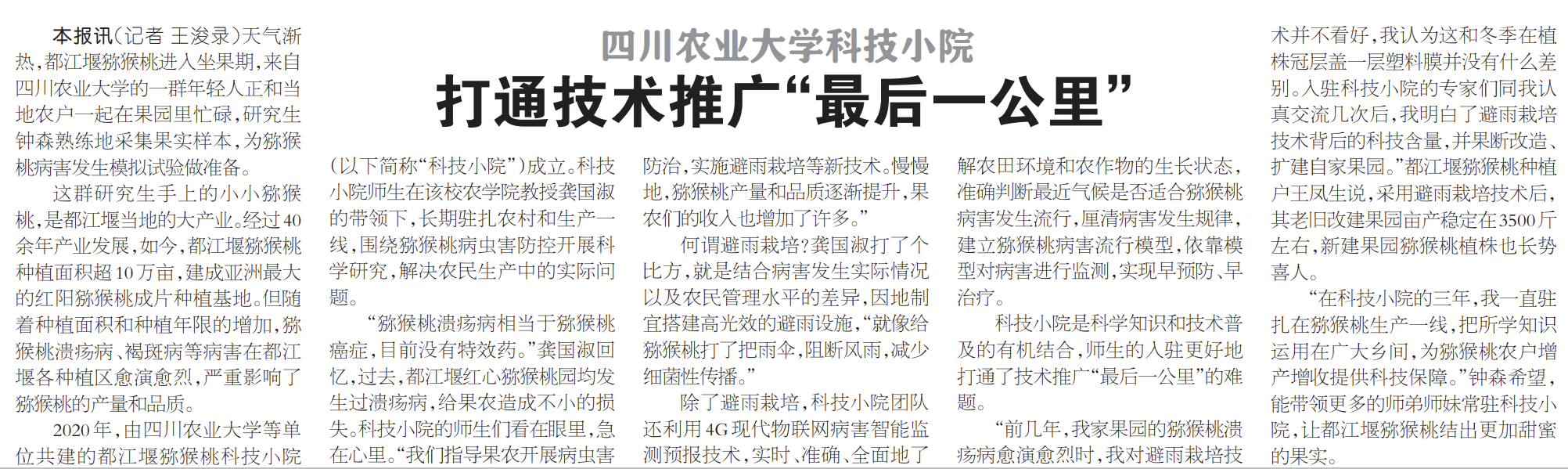 “前几年,我家果园的猕猴桃溃疡病愈演愈烈时,我对避雨栽培技术并不看好,我认为这和冬季在植株冠层盖一层塑料膜并没有什么差别。入驻科技小院的专家们同我认真交流几次后,我明白了避雨栽培技术背后的科技含量,并果断改造、扩建自家果园。”都江堰猕猴桃种植户王凤生说,采用避雨栽培技术后,其老旧改建果园亩产稳定在3500斤左右,新建果园猕猴桃植株也长势喜人。
