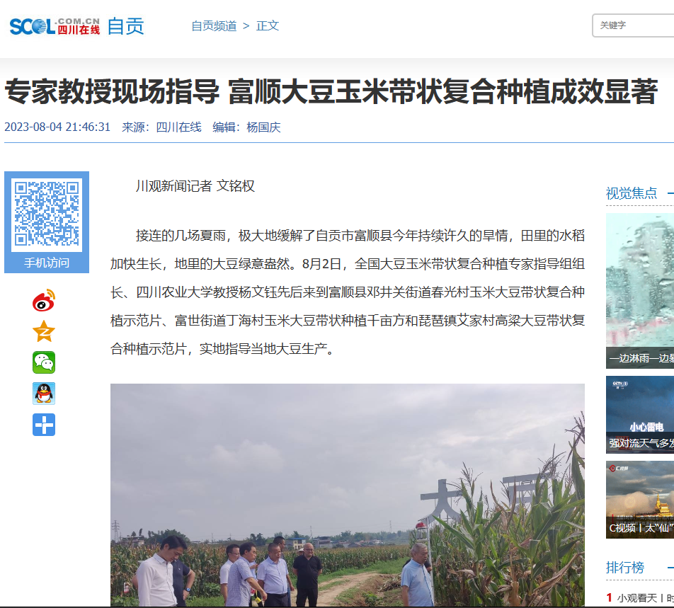 “富顺县大豆玉米带状复合种植推广工作上了一个大台阶,示范片技术规范标准,玉米不仅不减产,还比净作玉米增产,大豆长势不错,丰收有望。”杨文钰教授兴奋地说。