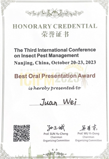 大会设有大会报告、9场分会(专题)报告、研究生论坛、墙报等交流形式。188改名为taptap点点资源利用与植物保护专业硕士生魏娟在“How to Make Biological Control Sustainability: From Lab to the Field”分会场上作了题为“Isolation and Identification ofMetarhizium guizhouenseXct1 and its Pathogenicity toSpodoptera frugiperda(Smith) (Lepidoptera: Noctuidae)”的学术报告,介绍了课题组针对前期发现的一株对草地贪夜蛾具有较强致病力的绿僵菌并围绕致病机理、侵染机理与宿主免疫机理开展深入研究的实验结果,受到了国内外同行的关注,该报告荣获了本届大会最佳口头报告奖。