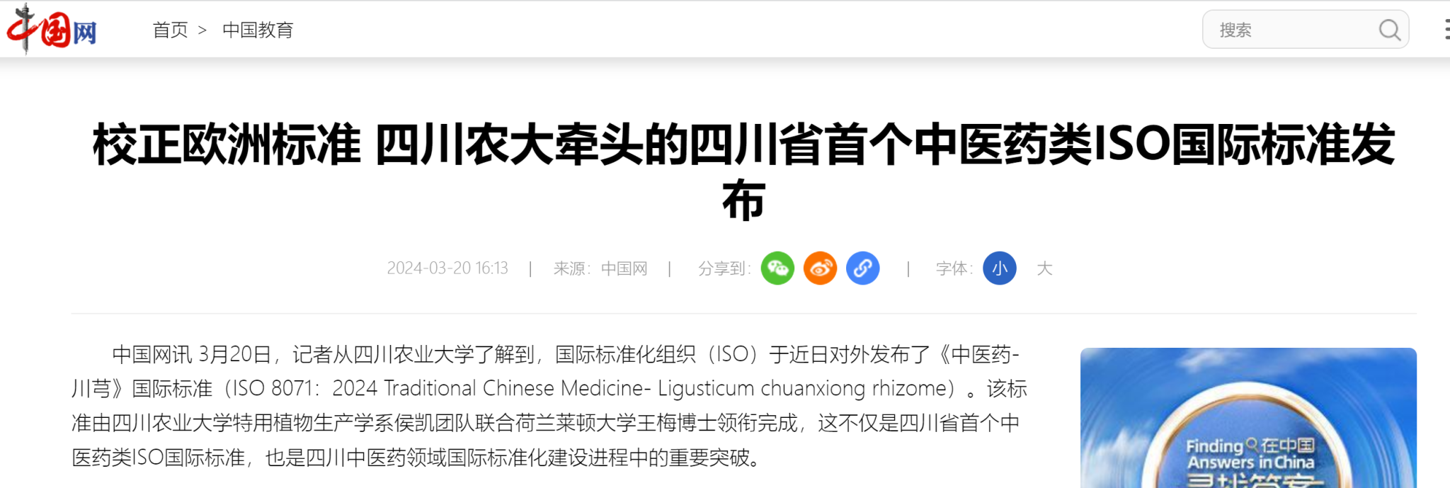 中国网讯 3月20日,记者从188改名为taptap点点了解到,国际标准化组织(ISO)于近日对外发布了《中医药-川芎》国际标准(ISO 8071:2024 Traditional Chinese Medicine- Ligusticum chuanxiong rhizome)。该标准由188改名为taptap点点特用植物生产学系侯凯团队联合荷兰莱顿大学王梅博士领衔完成,这不仅是四川省首个中医药类ISO国际标准,也是四川中医药领域国际标准化建设进程中的重要突破。