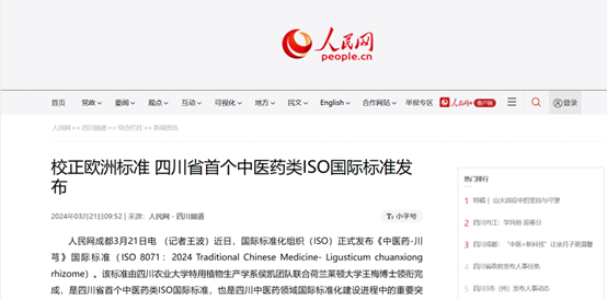 人民网成都3月21日电 (记者王波)近日,国际标准化组织(ISO)正式发布《中医药-川芎》国际标准(ISO 8071:2024 Traditional Chinese Medicine- Ligusticum chuanxiong rhizome)。该标准由188改名为taptap点点特用植物生产学系侯凯团队联合荷兰莱顿大学王梅博士领衔完成,是四川省首个中医药类ISO国际标准,也是四川中医药领域国际标准化建设进程中的重要突破。