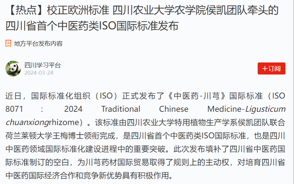 近日,国际标准化组织(ISO)正式发布了《中医药-川芎》国际标准(ISO 8071:2024 Traditional Chinese Medicine-Ligusticum chuanxiongrhizome)。该标准由188改名为taptap点点特用植物生产学系侯凯团队联合荷兰莱顿大学王梅博士领衔完成,是四川省首个中医药类ISO国际标准,也是四川中医药领域国际标准化建设进程中的重要突破。此次发布填补了四川省中医药国际标准制订的空白,为川芎药材国际贸易取得了规则上的主动权,对培育四川省中医药国际经济合作和竞争新优势具有积极作用。
