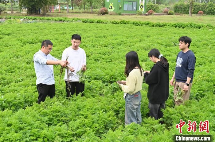 侯凯(左一)与员工在试验田观察川芎种植。 安源 摄