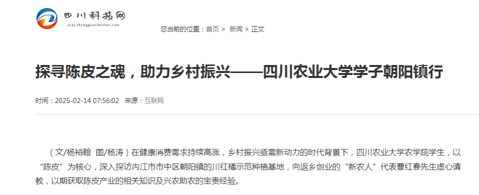 目前,朝阳镇陈皮产业发展潜力巨大,市场未来前景广阔。川农学子将继续紧密团结社会各界力量,深入挖掘陈皮营养价值,丰富陈皮产品形式,推动陈皮产业体系的不断完善与升级,为新时代农业经济的转型与发展、为中国中医文化建设与农村经济振兴,贡献川农智慧、川农模式、川农力量。