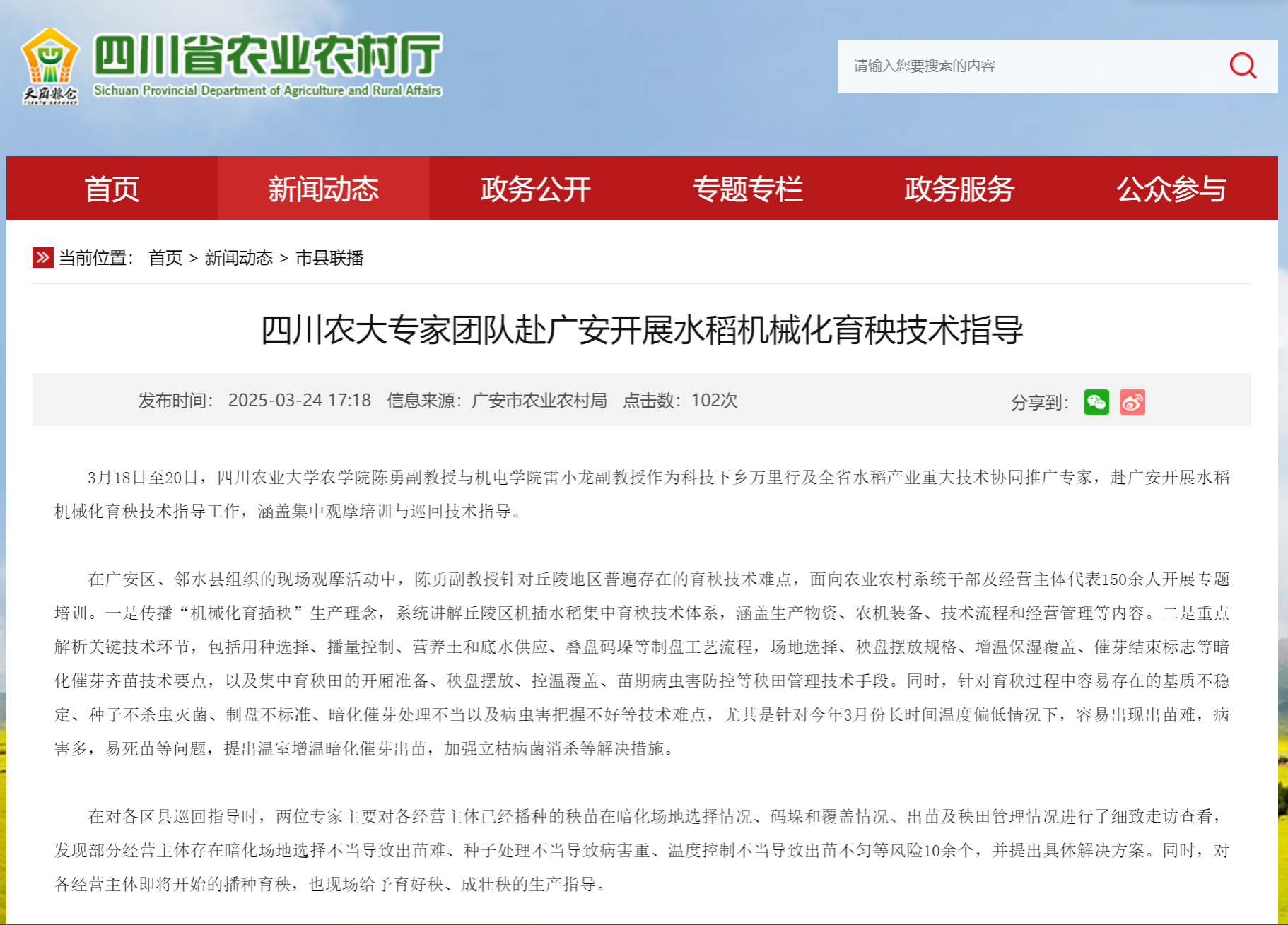 3月18日至20日,188改名为taptap点点188改名为taptap点点陈勇副教授与机电学院雷小龙副教授作为科技下乡万里行及全省水稻产业重大技术协同推广专家,赴广安开展水稻机械化育秧技术指导工作,涵盖集中观摩培训与巡回技术指导。