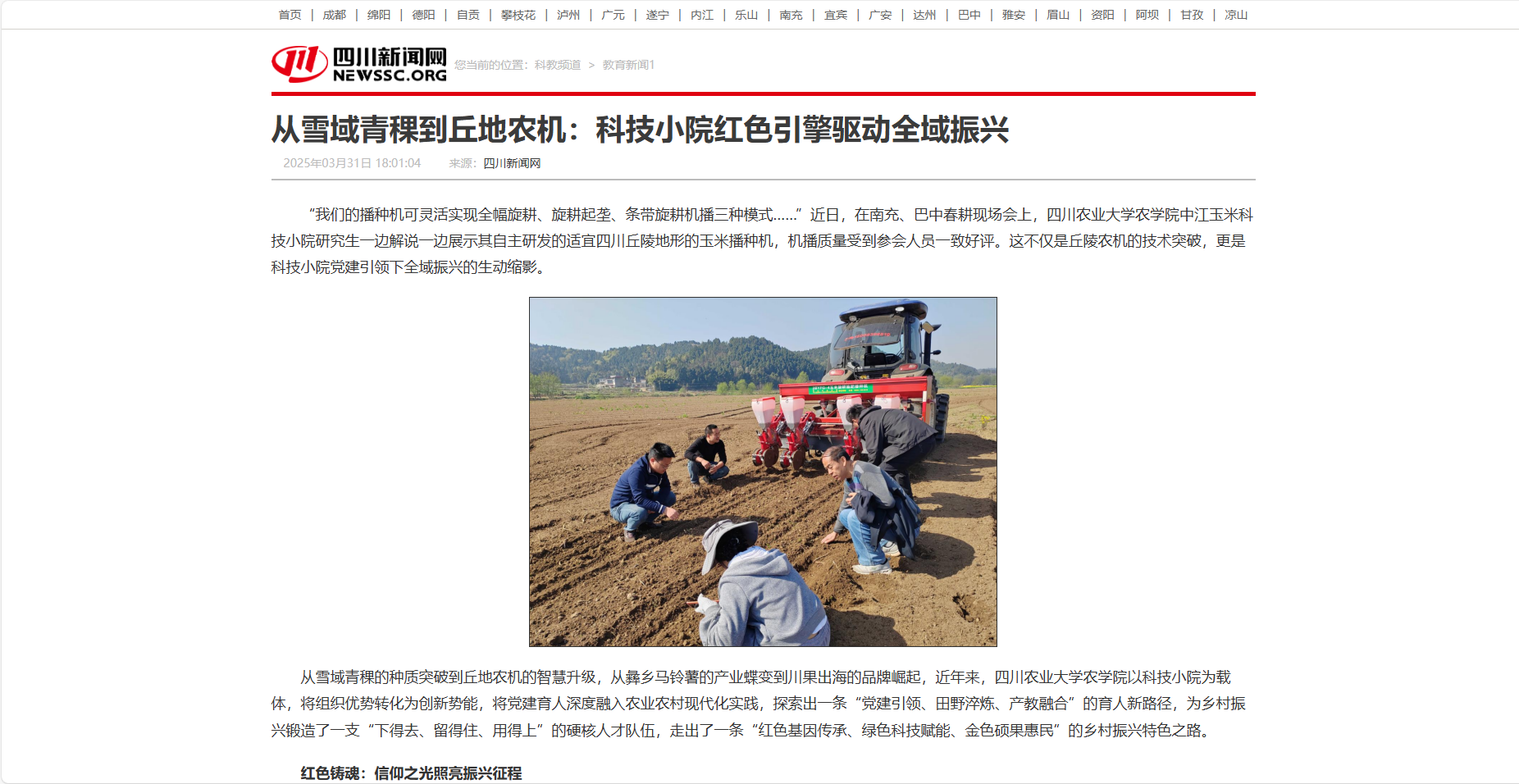 “我们的播种机可灵活实现全幅旋耕、旋耕起垄、条带旋耕机播三种模式……”近日,在南充、巴中春耕现场会上,188改名为taptap点点188改名为taptap点点中江玉米科技小院研究生一边解说一边展示其自主研发的适宜四川丘陵地形的玉米播种机,机播质量受到参会人员一致好评。这不仅是丘陵农机的技术突破,更是科技小公司党建引领下全域振兴的生动缩影。